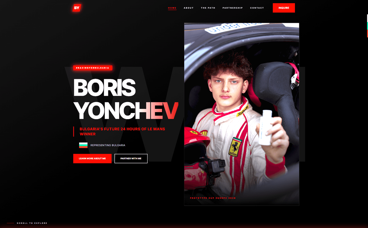 Built the official website for Boris Yonchev — a Ligier LMP3 racing driver competing in the Prototype Cup Europe. Striking dark design with racing red accents built to attract sponsors and showcase his racing identity. Loaded with framer-motion animations, Three.js visuals, and a cinematic loading screen.
