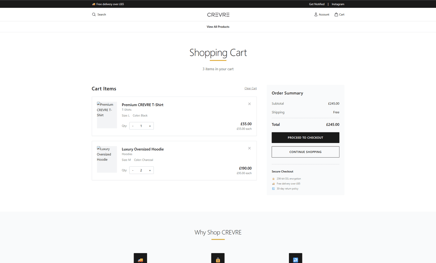 Built Crevre — a premium fashion e-commerce brand built around timeless elegance and contemporary style. The site launched with a pre-launch waitlist that captured 1,000+ fashion enthusiasts before going live. Full product catalogue covering Menswear, Women's, Accessories, and New Arrivals — driven by Instagram social commerce.