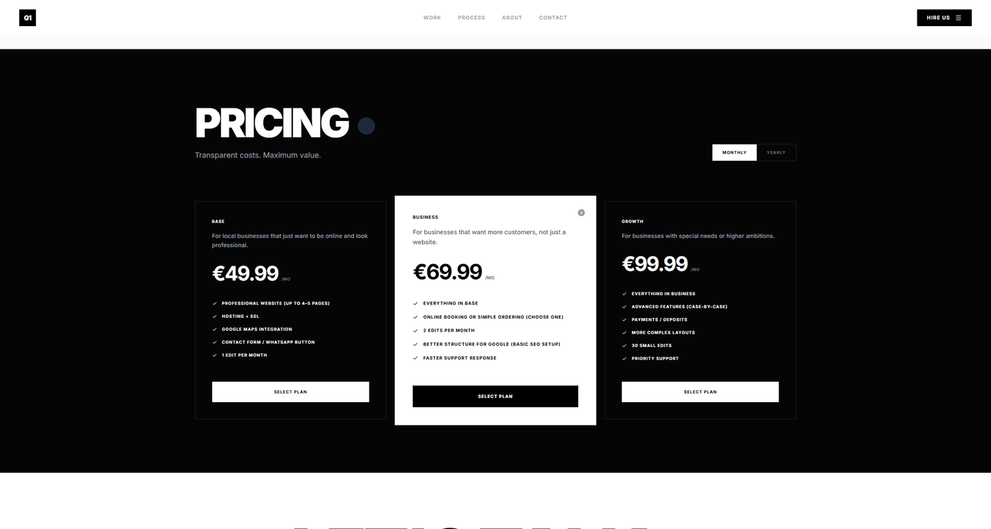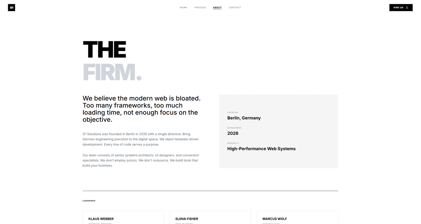 Built the website for G1 Solutions — a digital agency delivering digital excellence through web design and development. Bold, minimal black-and-white design using Inter and Cairo typefaces, with a clean services showcase and a live project status board.
