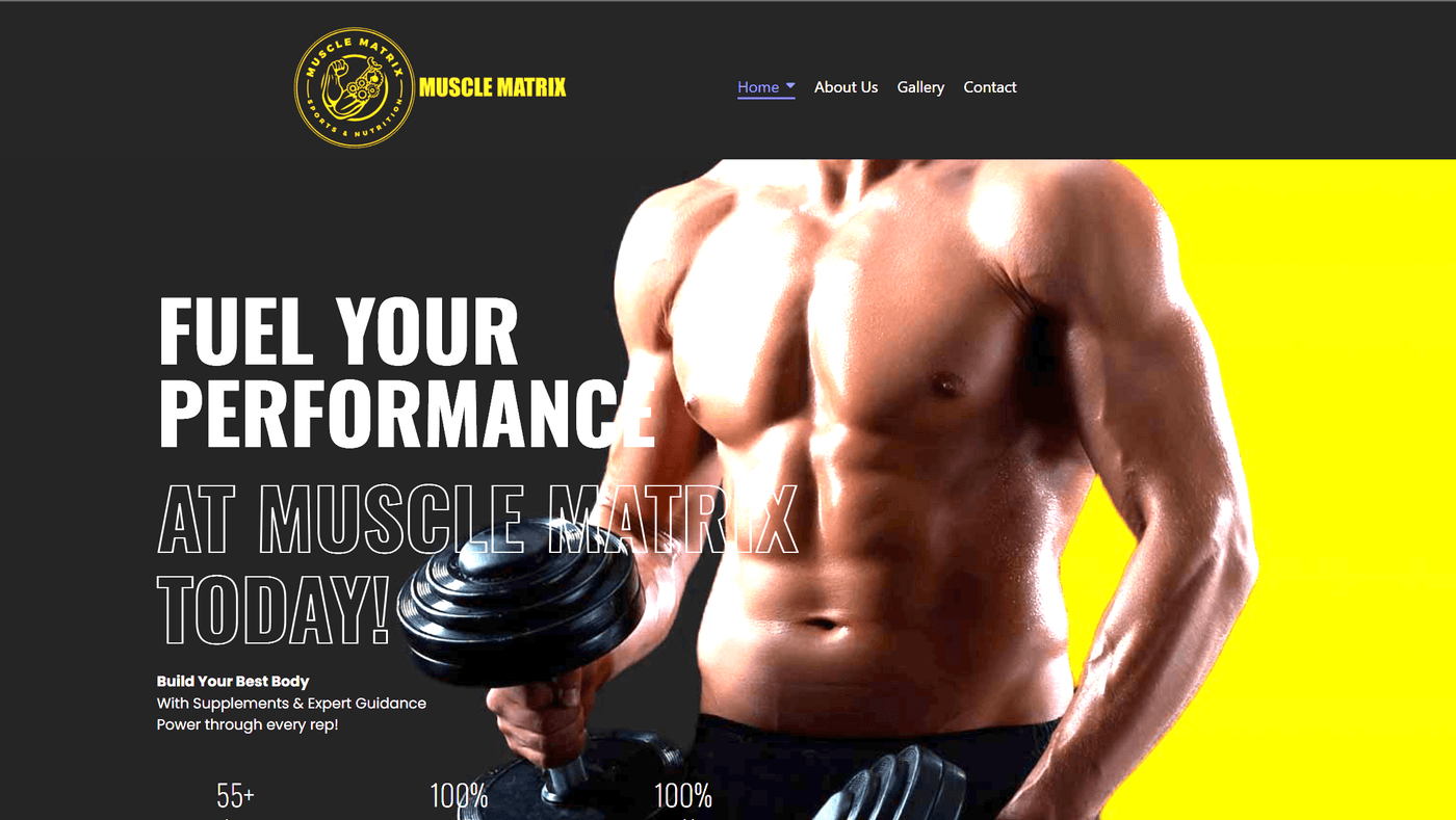 Built Muscle Matrix — a UK sports nutrition brand site specialising in high-quality supplements for muscle growth, energy, and recovery. Full product showcase covering Whey Protein, Pre-Workout, BCAA, Creatine, Fat Burners, and Wellness Packs, plus personalised supplement plans and expert training guidance.