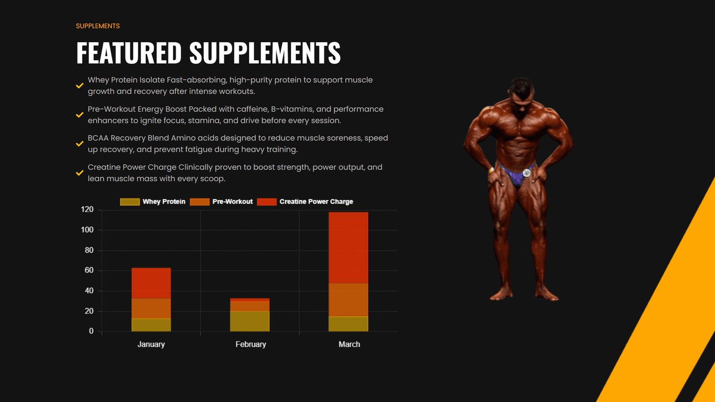 Full supplement catalogue: Whey Protein Isolate, Pre-Workout Energy Boost, BCAA Recovery Blend, Creatine Power Charge, Fat Burners, and Daily Wellness Packs.