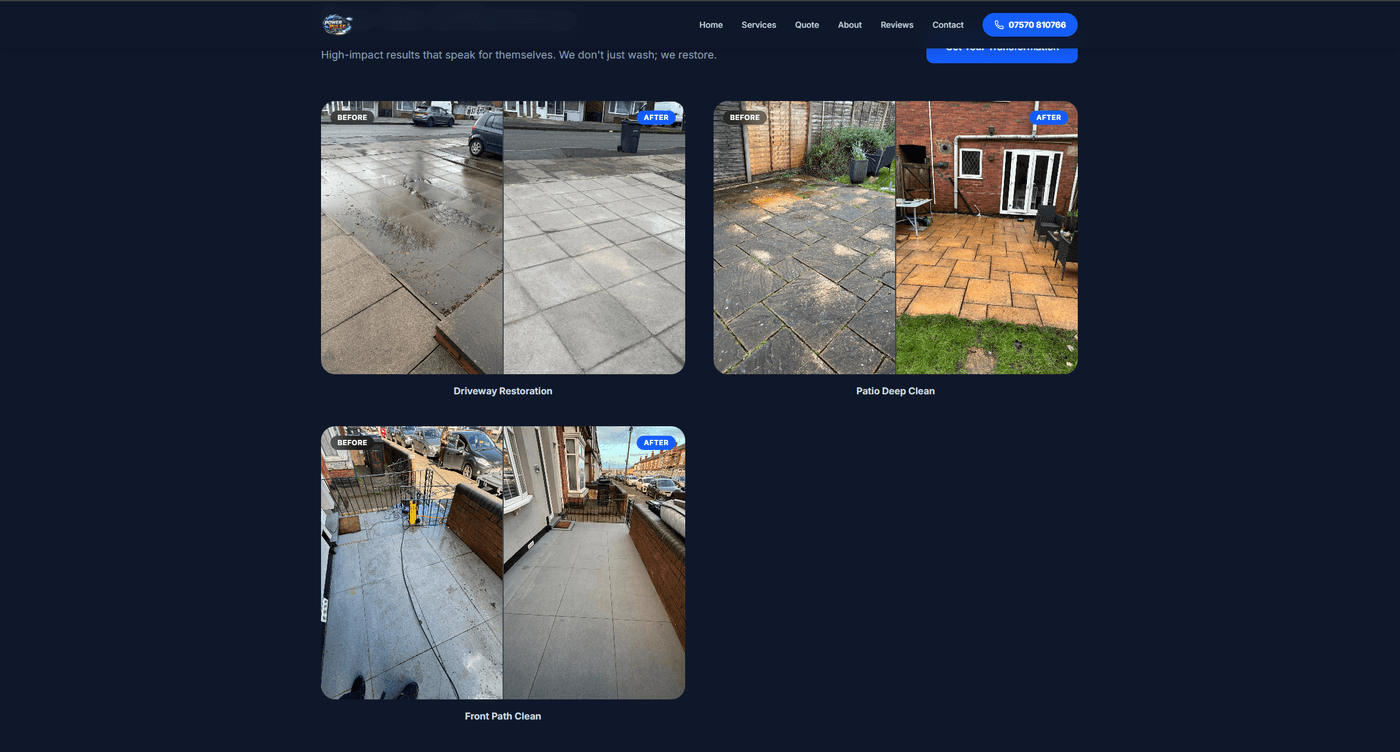 Built Power Pulse Solutions — a professional jet washing and pressure washing service website for a Sutton Coldfield-based business. Covers driveways, patios, roofs, gutters, windows, cars, walls, and commercial forecourts. The site is built to convert visitors into booked jobs with a direct call CTA and online quote form.