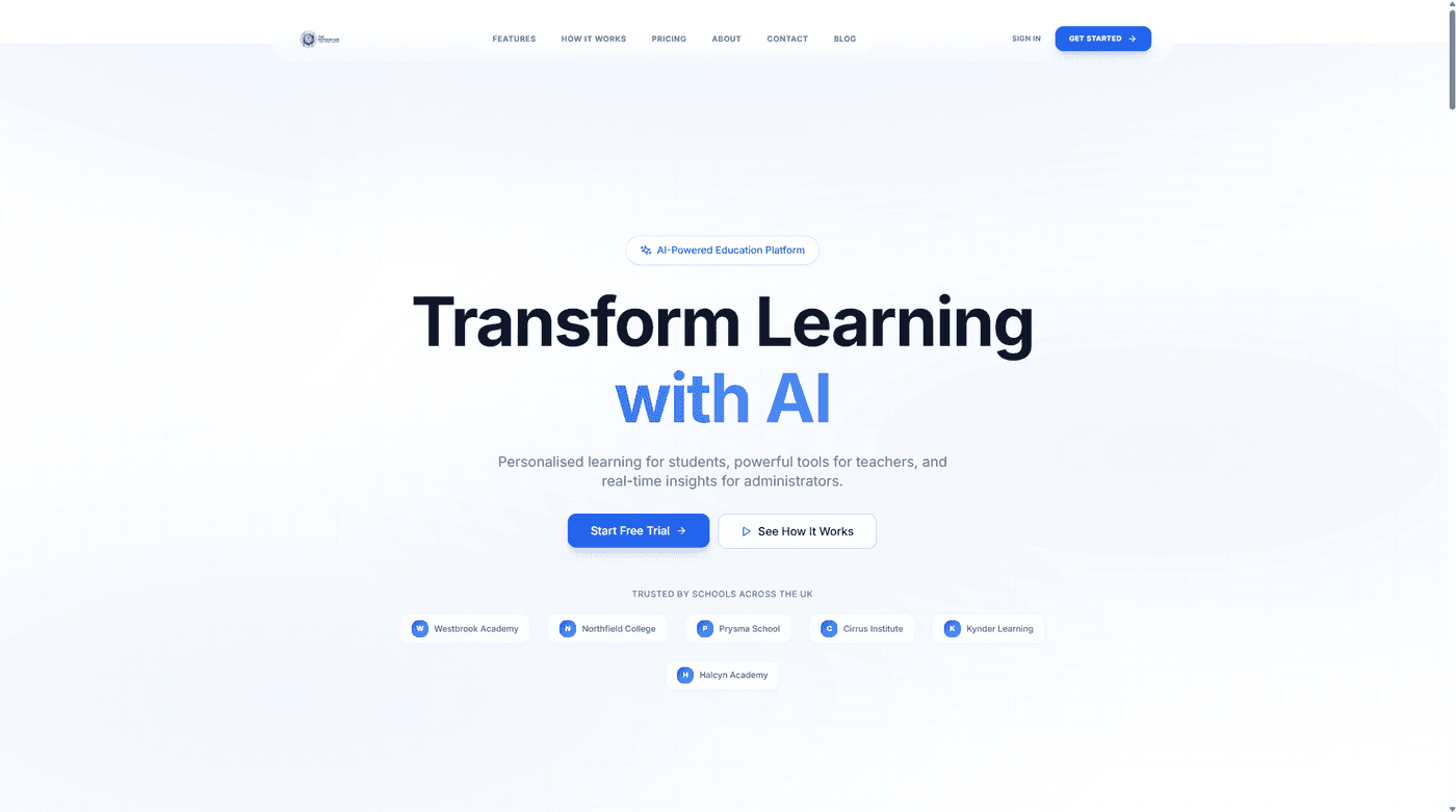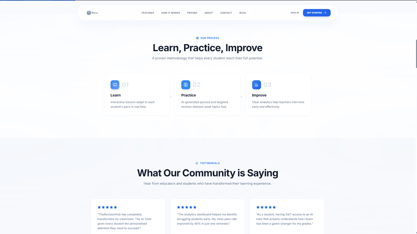 Built TheRevisionHub — an AI-powered revision and learning platform helping students ace their exams. Features 24/7 AI tutoring, smart study plans, AI-enhanced course creation, and real-time analytics. Designed for students, teachers, and schools with tiered plans from Free to School enterprise.